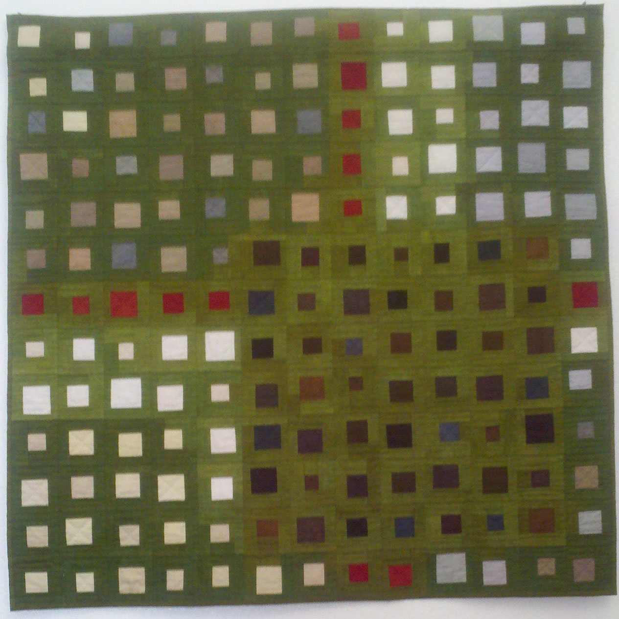 I recently brought an extraordinary craft work into my home.  It is a quilt by Diane Friedlander-Bowman from her Room for Squares series.  It is made up of 169 small squares, framed by 169 larger squares, making up 5 overlapping squares, within one larger square.  Each little tiny square of fabric is hand dyed, mottled, deep. This quilt is the quintessential metaphor for American culture – small separate discreet bits of a variety of colors and sizes, sometimes overlapping, all sewn together to make a whole, hand-made in America.