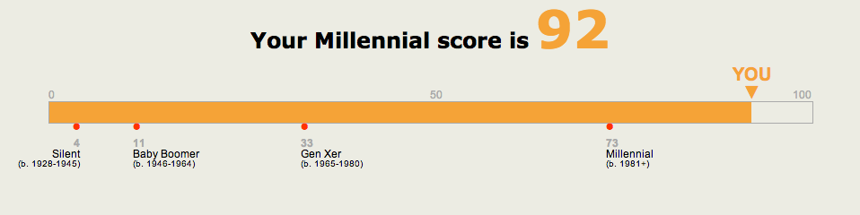 1. I chuckled as I read this blog entry for many, my reasons, but mainly because I am one of the “friends” Linda talks about. I took the quiz and I received a 98 (I believe the highest score from all the people who have taken the quiz within Linda’s group) so I guess I am a Millennial.