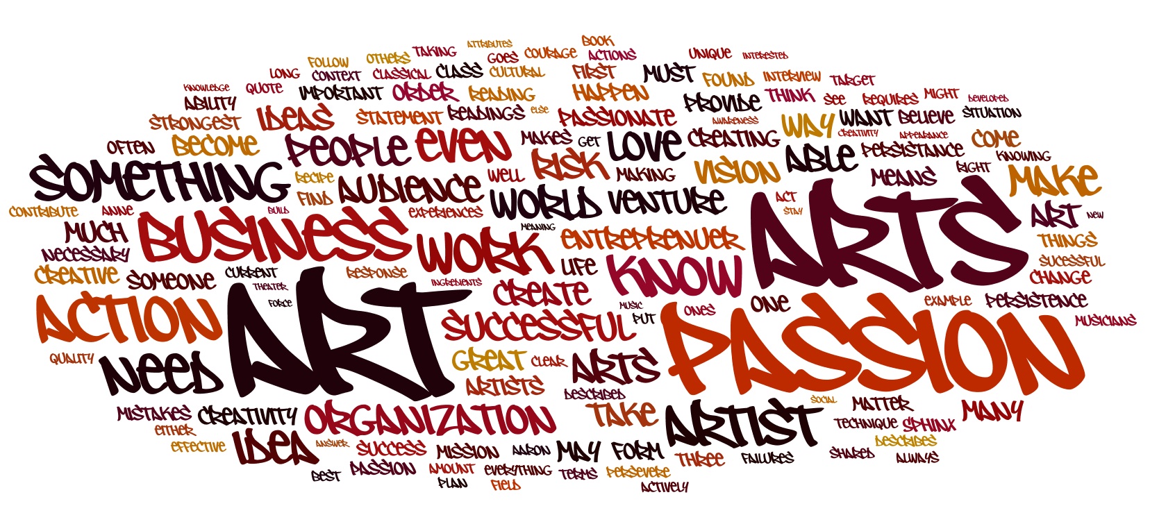 My undergraduate arts entrepreneurship class had its first meeting Tuesday, during which the students and I discussed the nature of entrepreneurial action. Then they went off on their own to read the first chapter of Ann Bogart’s “And Then, You Act” and Barry Hessenius’s interview with Aaron Dworkin so that they could comment on our online discussion forum about what it means to be an “arts entrepreneur,” an actor in the cultural space. The theme of “passion” ran, hmmm, passionately through their responses. To summarize what they said, I aggregated their text, removed the names “Bogart,” and “Dworkin” and the word “entrepreneursip” to create the word cloud below, which again evidences that arts entrepreneurship keeps art and passion at its center. The writing prompt was as follows: