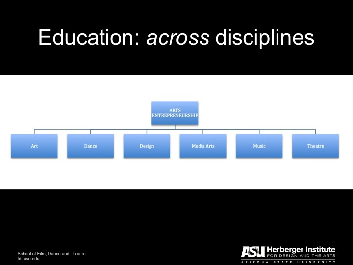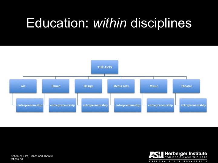 What is needed as these educational initiatives move forward – especially within academia — is a connection between the research and the education. I had a conversation with a colleague about this recently. He is concentrating his research and research dissemination efforts on arts entrepreneurship in the context of higher education. I reminded him that when he trained for his PhD in musicology, he didn’t study musicology in the higher ed context, but rather he studied musicology. Similarly, if arts entrepreneurship is to move forward in the academy as a discipline of “practice and inquiry” we will need to build up our knowledge of arts entrepreneurship itself so that we are teaching arts entrepreneurship to our students and not merely teaching pedagogy, or teaching people to teach.