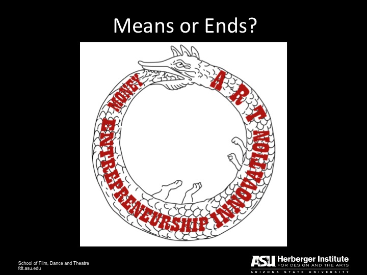 So, to return to arts venturing and our Ouroboros: is the creation of a business a means? Or an end? I remind you of the distinguishing feature of arts business and our Ouroboros. What distinguishes the arts business from tech businesses or manufacturing? When it comes to arts-based businesses, it’s not about the Benjamins, it’s about the art.